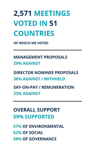 Our work doesn’t stop at the ballot. After we vote, BCI directly follows up with select portfolio companies to ensure they understand our rationale and expectations. We also closely review our voting record to see how we made an impact and find areas to refine our approach. This review is an important step in preparing for any repeat shareholder proposals and will inform our biennial Proxy Voting Guideline update planned for 2025.