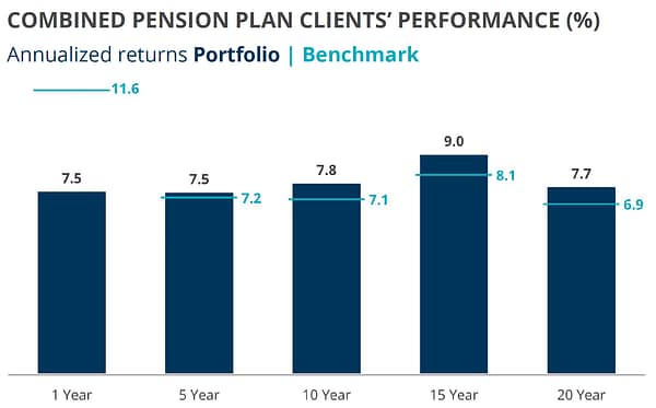 “Our one-year relative performance lagged the benchmark this fiscal. This was no surprise as the exponential growth of the ‘Magnificent Seven’ tech stocks resulted in a very strong combined pension plan benchmark hurdle. We build portfolios that provide clients with the risk-adjusted returns they require over the long term, and that’s where we will continue to focus on adding value.”